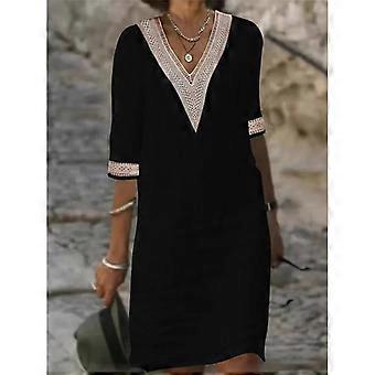 Women's Plain V-Neck Lace-Trimmed Mid-Sleeve Cotton And Linen Casual Dress