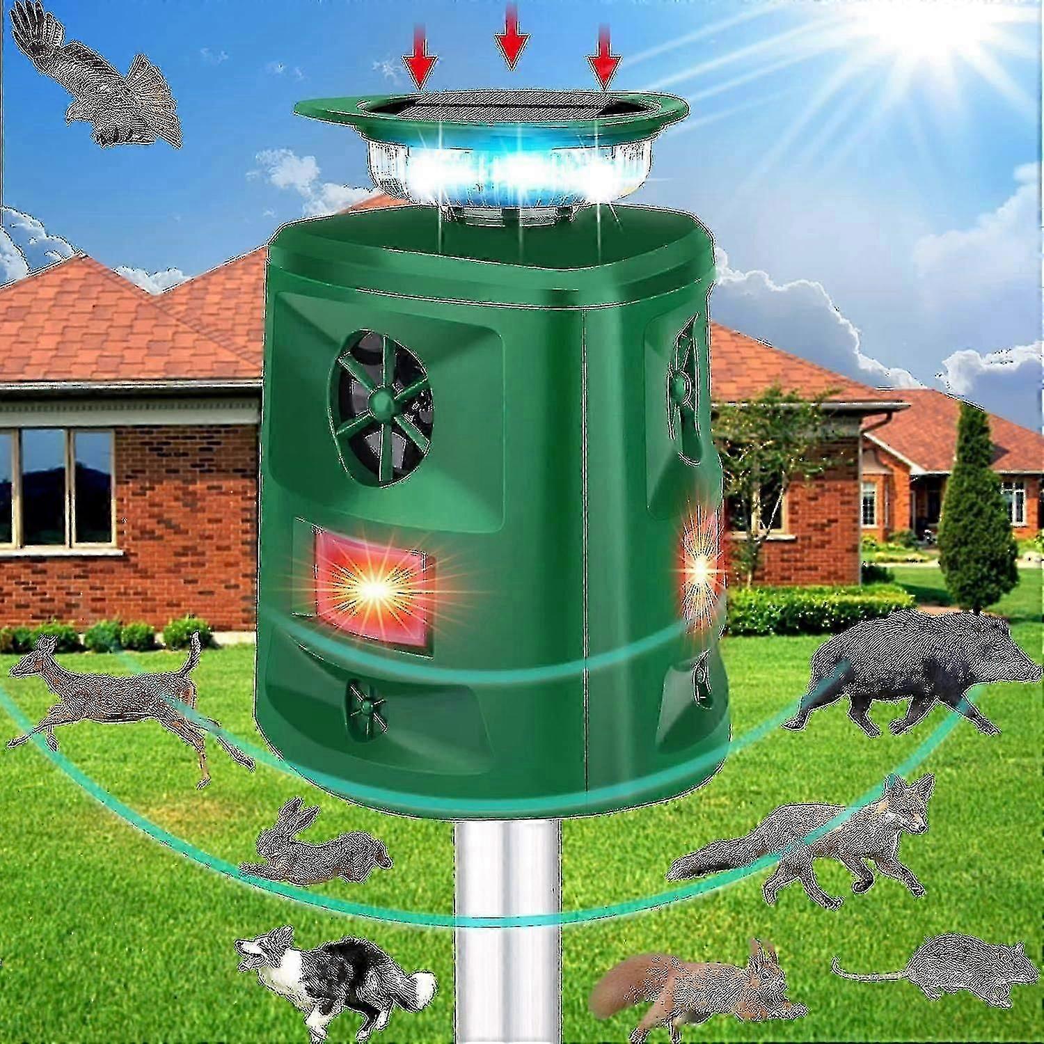Features of the Human & Environment Friendly Animal Solar Repeller: Humane and Environmentally Friendly: Utilizes ultrasonic waves to repel animals without causing harm. Safe for humans and pets as it does not contain chemicals. Wide Coverage and Upgraded Design: Equipped with three sides, each featuring an infrared sensor for 360-degree coverage. Detects small movements of animals up to 30 feet away. Utilizes ultrasonic technology, alarm sounds, and flashing lights to scare away intruders. Five Operation Modes: Offers adjustable settings with five different operation modes: Ultrasonic horn alarm sound drive Ultrasonic horn emits bird calls for repelling Ultrasonic waves combined with blue and white strobe lights Ultrasonic horn emits owl calls for repelling Infrared blue and white LED night mode The cycle mode activates all functions sequentially until the animal leaves the sensor range. Solar-Powered and Waterproof: Features a solar panel for efficient outdoor operation, converting sunlight into power. Can also be charged via USB cable (included). Waterproof design with IP44 rating ensures durability in various weather conditions. Portable and Easy to Use: Compact and portable design allows for easy insertion into soil where sunlight reaches. Maintenance-free operation. Suitable for outdoor use, including camping trips. Replacement available if any issues arise. This animal repellent device provides an effective, eco-friendly solution for keeping unwanted animals away from your home, garden, or yard.