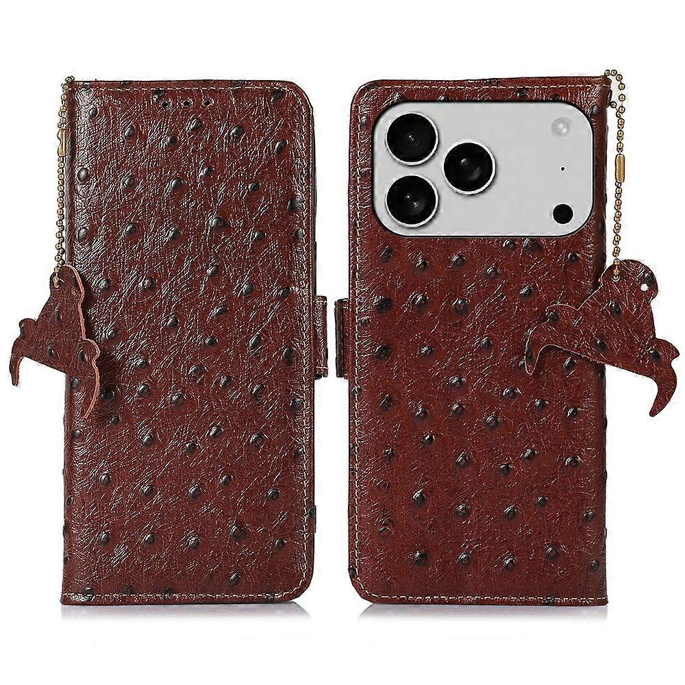 TKdaddy For iPhone 17 Pro Max Case RFID Blocking Genuine Cow Leather Phone Case Ostrich Texture Coffee
