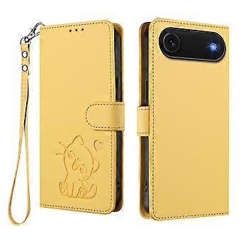 TKdaddy For iPhone 17 Air Wallet Case with Wrist Strap Love Cat Pattern Imprint Leather Phone Cover Yellow
