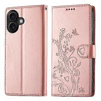 TKdaddy لهاتف iPhone 16 حافظة محفظة بصمة فراشة زهرية غطاء هاتف جلد PU مع حزام معصم ذهبي وردي