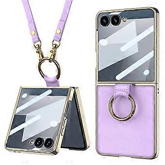 TKdaddy GKK For Samsung Galaxy Z Flip7 5G Case Ring Kickstand PU Leather + PC Phone Cover with Small Screen Film / Shoulder Strap Purple