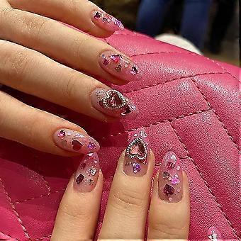 Press on Nails Almond Medium Pink Gradient with Love Gemstone and Silver Sequins 24PCS Valentine's Day Fake Nails