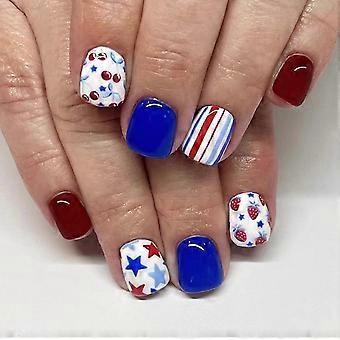 Press On Nails Kit Short Square Fake Nails Red and Blue Glossy Full Cover with Glue 24pcs