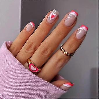 Valentines Press On Nails Set with Pink Acrylic Heart Design, Square Glossy Full Cover, 24 Pcs