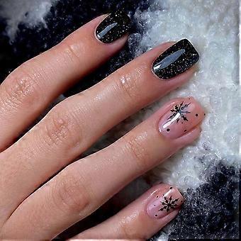 24Pcs Short Square Press on Nails Glitter Christmas Fake Nails Set with Black Snow Design