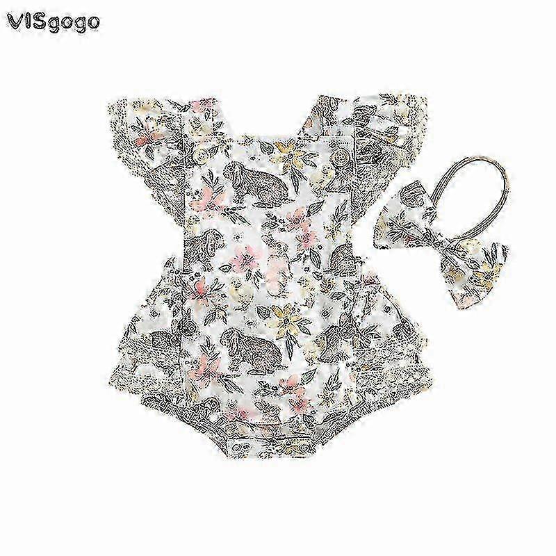 Visgogo Baby Girl 2pcs Easter Outfit Fly Sleeve Square Neck Ruffle Rabbit/deer Print Romper With Bow Headband Summer Clothes Set