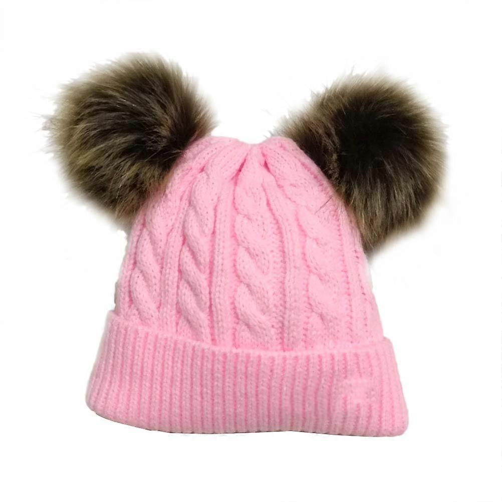 Warm Keeping Double Pompom Child Kids Beanie Hat for Children in Pink Color Using Knitting Tech 1Pack