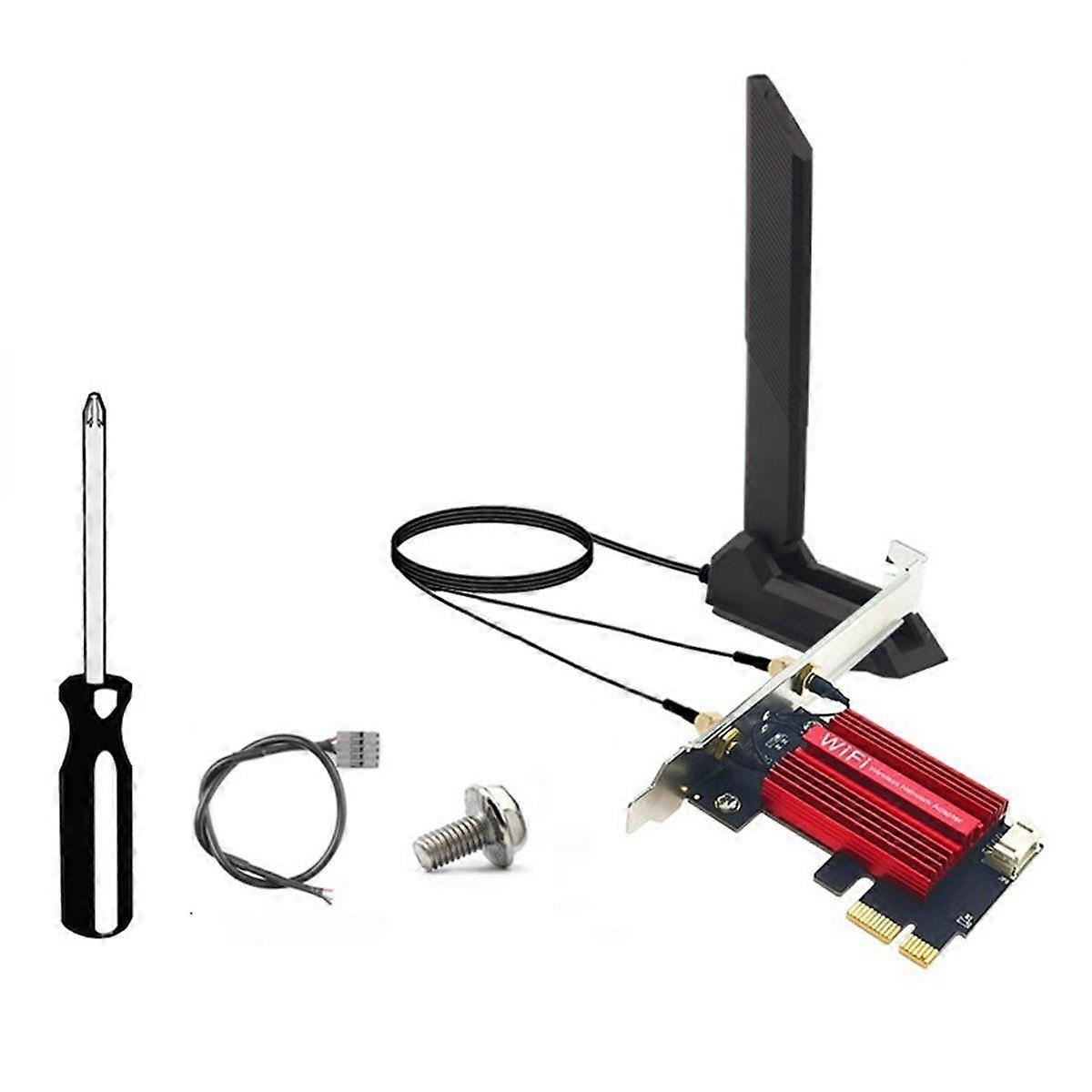 Ultra-Fast Speed: Experience blazing speeds up to 3000Mbps with the WiFi 6 technology. Ideal for gaming and high-speed streaming, this PCIe card ensures you get the best online experience. Dual Band Connectivity: Supports 2.4Ghz and 5Ghz bands, providing flexible connectivity options. Switch between bands to optimize your internet speed and network traffic. Advanced Bluetooth 5.2: With Bluetooth 5.2, enjoy enhanced connectivity with a range and faster speeds, perfect for connecting Bluetooth devices to your desktop. Compatibility: Designed specifically for 10 and 11 desktops, ensuring seamless integration and easy installation. Next-Gen WiFi 6 Technology: Utilize the latest 802.11AX standard for a more reliable and efficient wireless network, reducing latency and improving overall network efficiency. Specification: Name: Desktop wifi adapter Chipest: AX200NGW Standard IEEE: 802.11A/B/G/AC/AX Blutetooth: Blutetooth 5.2 Wireless Speed: 2.4G/574Mbps, 5G/2400Mbps Fast and Efficient: -MIMO Technology Supported Systems: Win10, Win11, Linux ( 5.1 and above), Chrome OS Note: to 2400Mbps (The wifi router must support 802.11ax) Color: Red Material: PCB+Plastic+Metal Package Contents: 1*Network Card 1*12DB Antenna 1*Bluetooth Cable 1*Screwdriver (random color) 1*Screw (random color) Only the above package content, other products are not included. Note: Light reflection and different displays may cause the color of the item in the picture a little different from the real thing. The measurement allowed error is +/- 1-3cm.