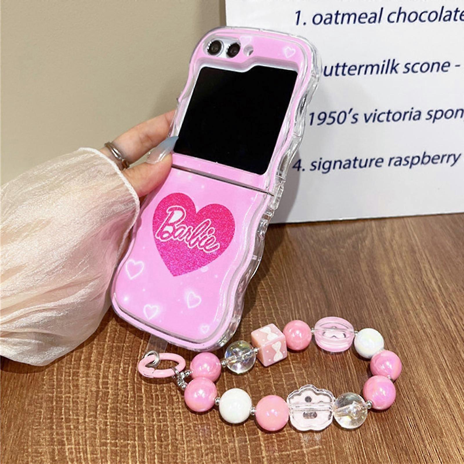 Z Flip 5 Cute Case Wave Edge Transparent, Pink Bead Chain Wrist Strap for Brabie Pattern TPU Soft Lovely Fashion Shockproof Cover for Women Girls